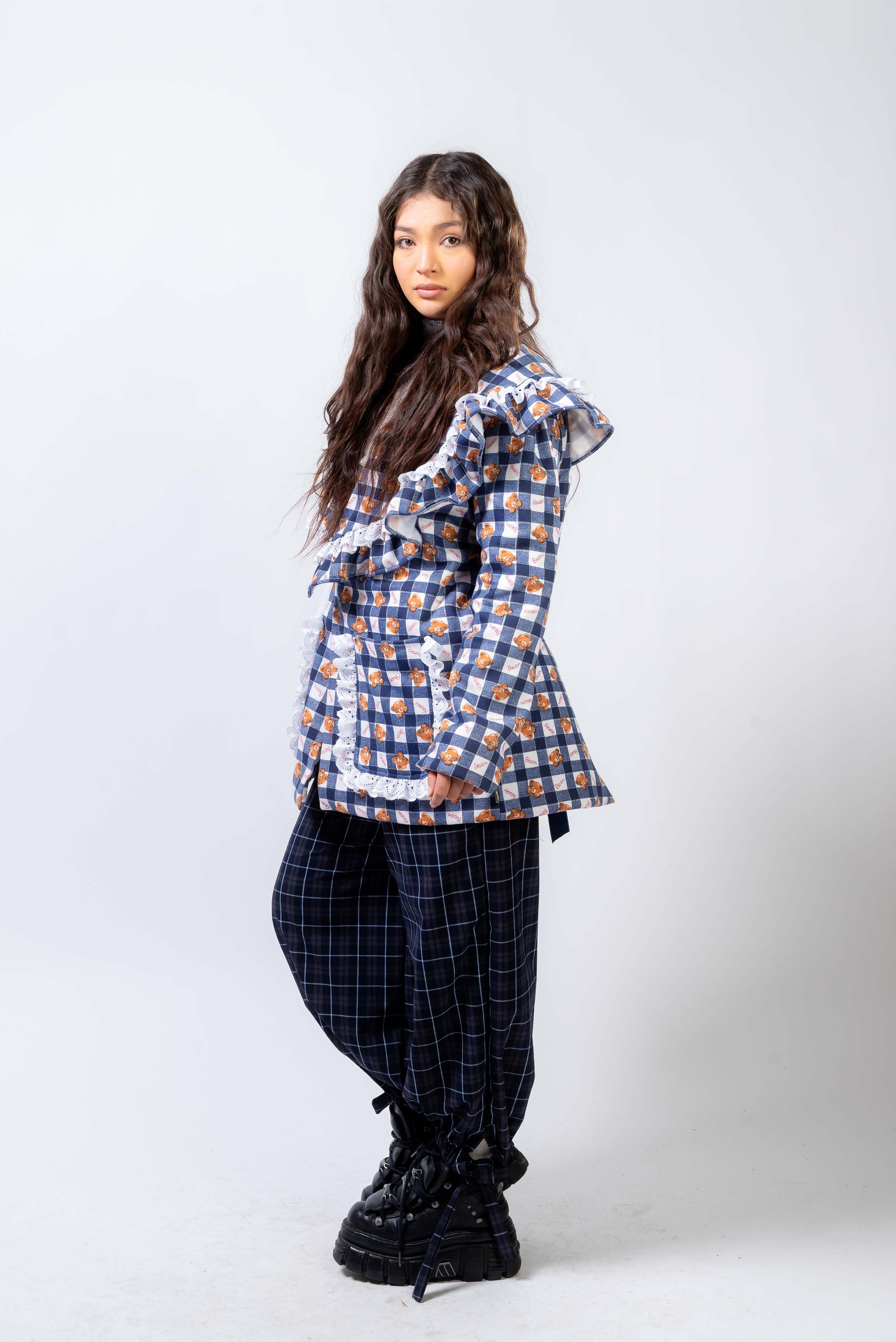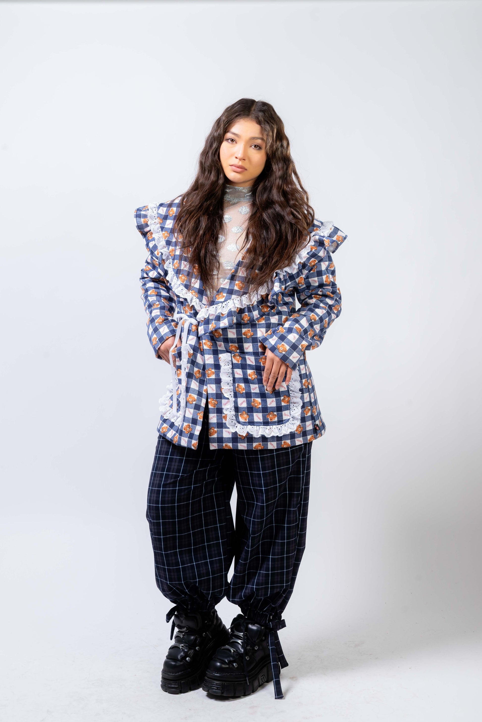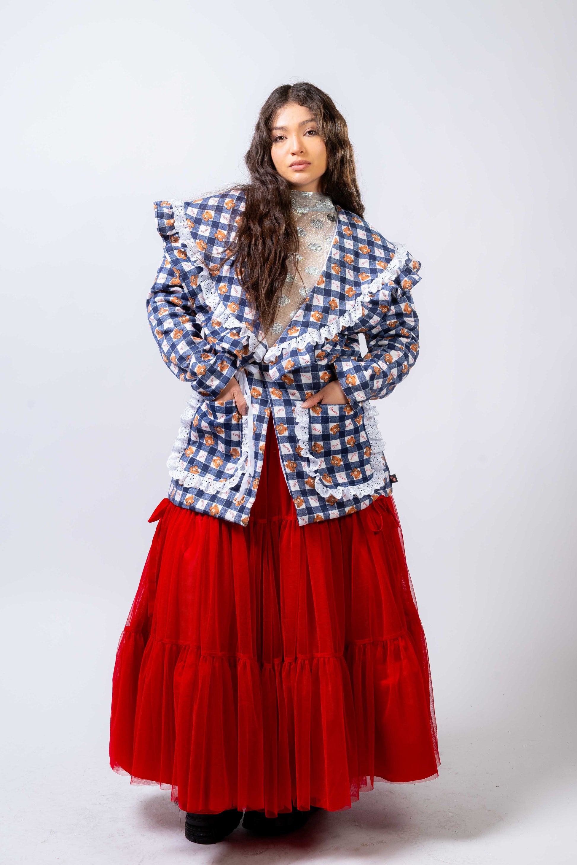 La americana XMAS transforma cualquier look con su vibe romántica y festiva. Su print de cuadros con detalles florales y encaje crea un encanto dulce y poderoso. Perfecta para brillar en días especiales o elevar tu estilo diario.