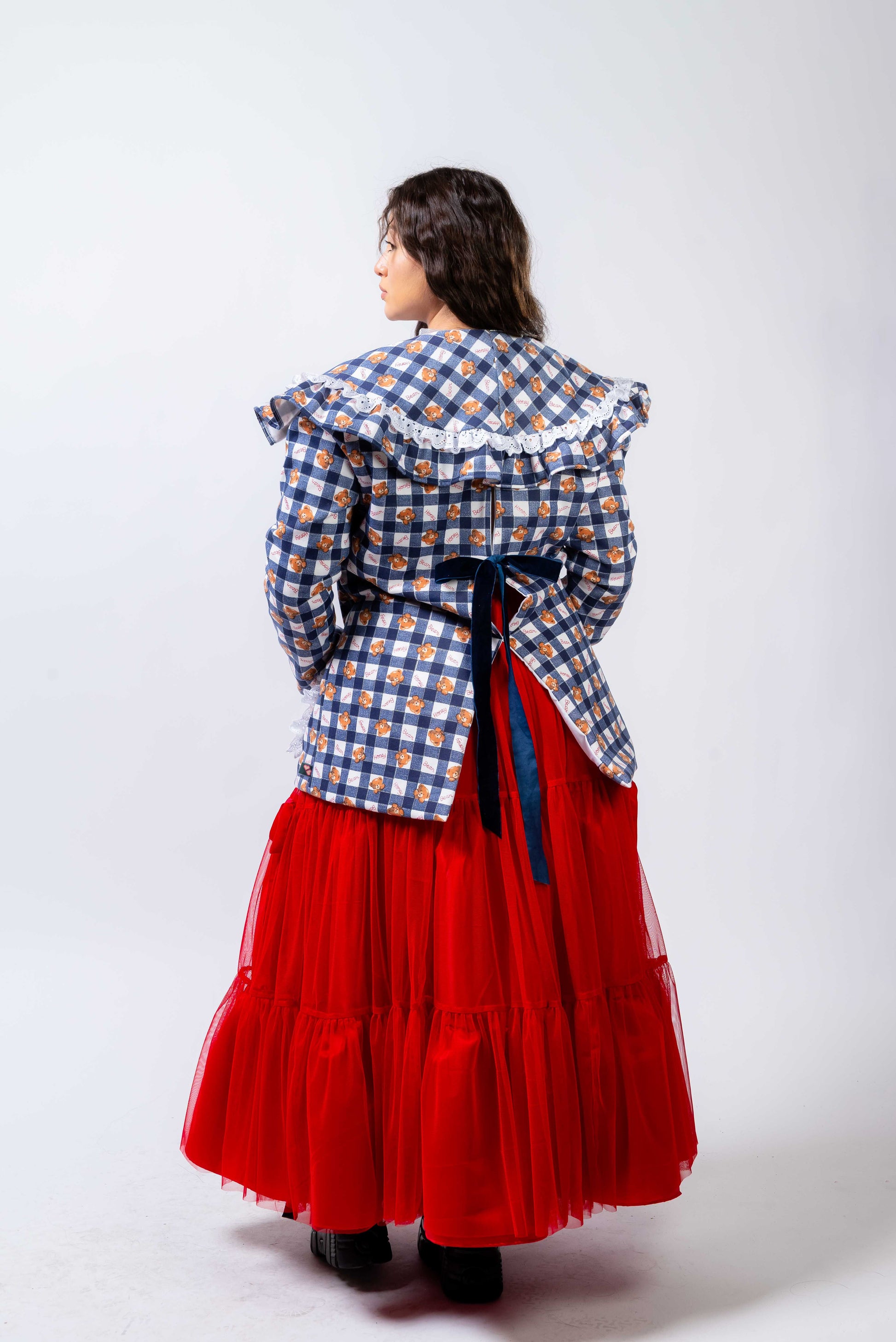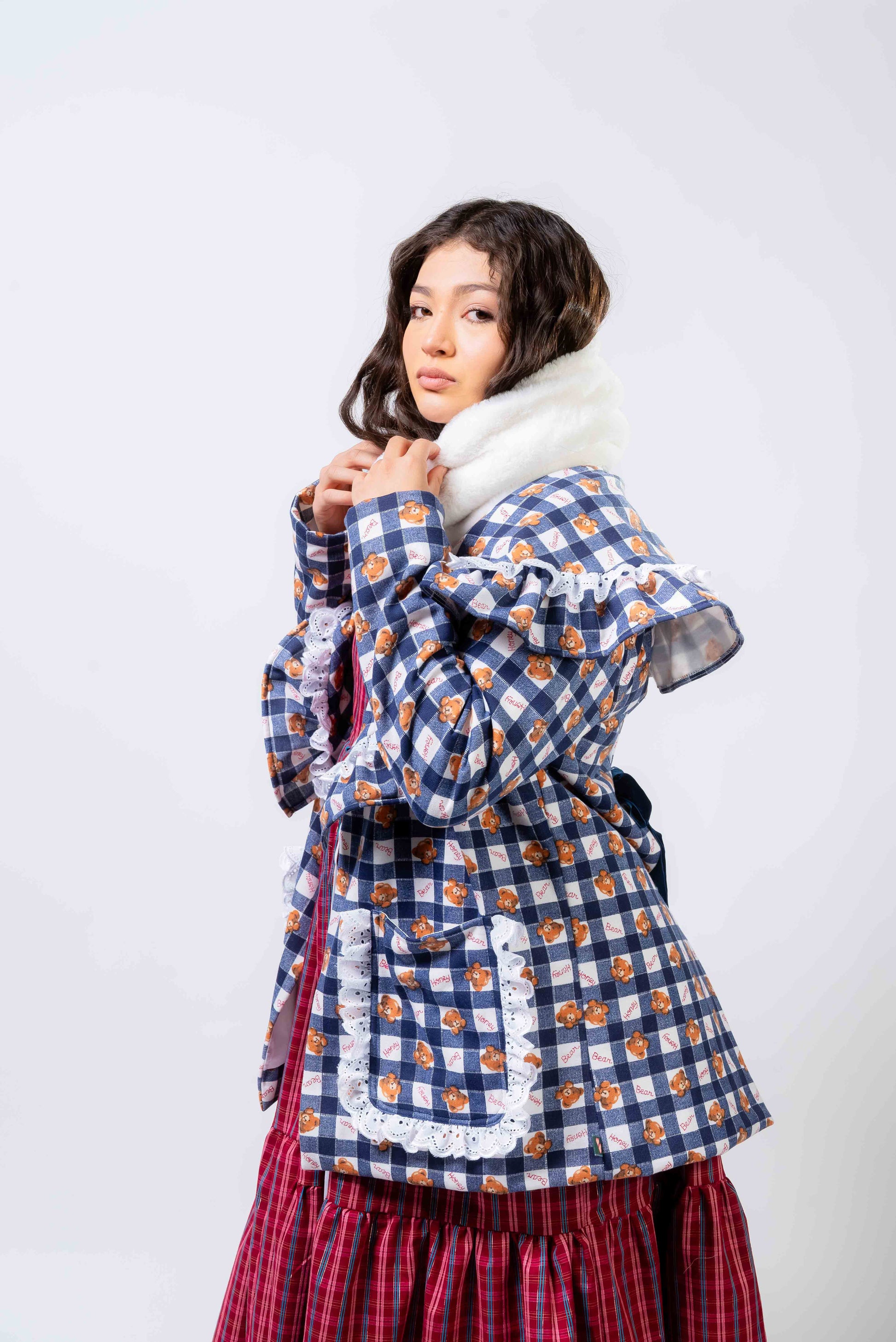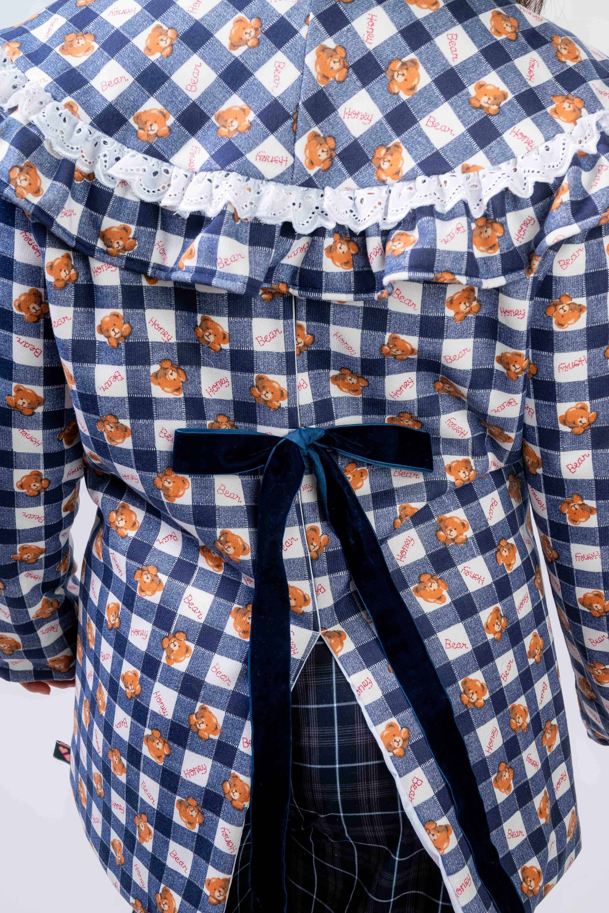 La americana XMAS transforma cualquier look con su vibe romántica y festiva. Su print de cuadros con detalles florales y encaje crea un encanto dulce y poderoso. Perfecta para brillar en días especiales o elevar tu estilo diario.