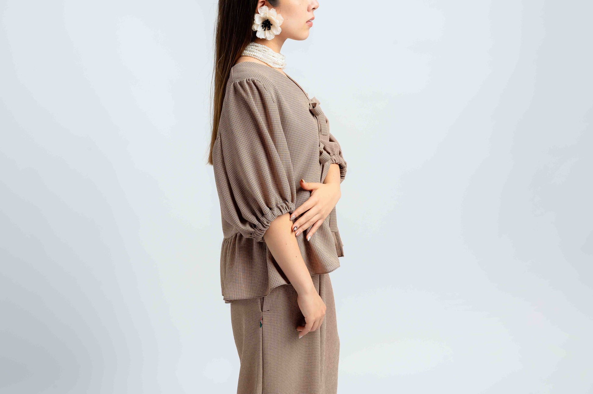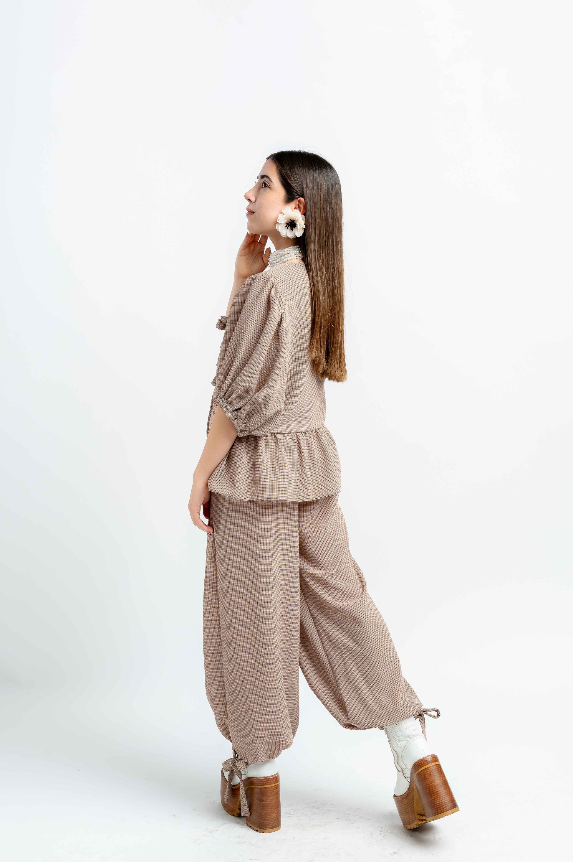 La Blusa Agus es una oda a la dulzura cotidiana: su diseño con moños al frente, mangas abullonadas y vuelo ligero en la parte baja aporta movimiento y encanto sin esfuerzo. Confeccionada en un tejido suave de microcuadro en tono latte, se adapta a cualquier ocasión con un aire vintage y femenino. Perfecta para usar sola o como parte del set completo.