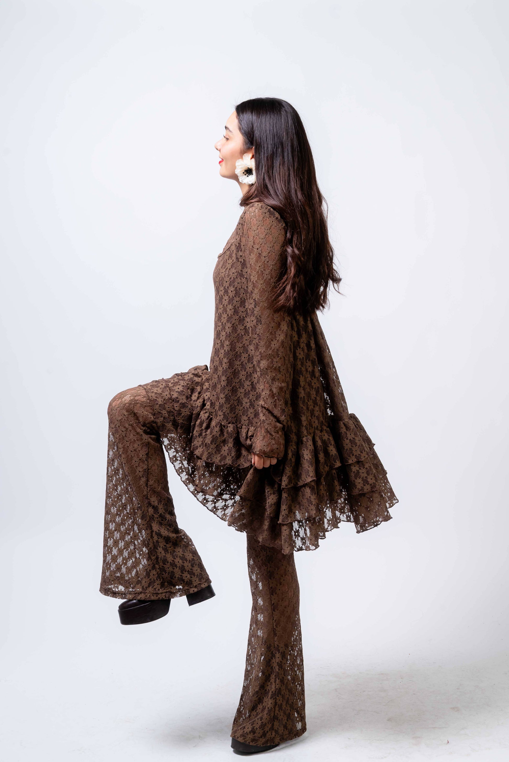 Encaje suave en un tono delicioso y único. Los olanes aportan romanticismo moderno.