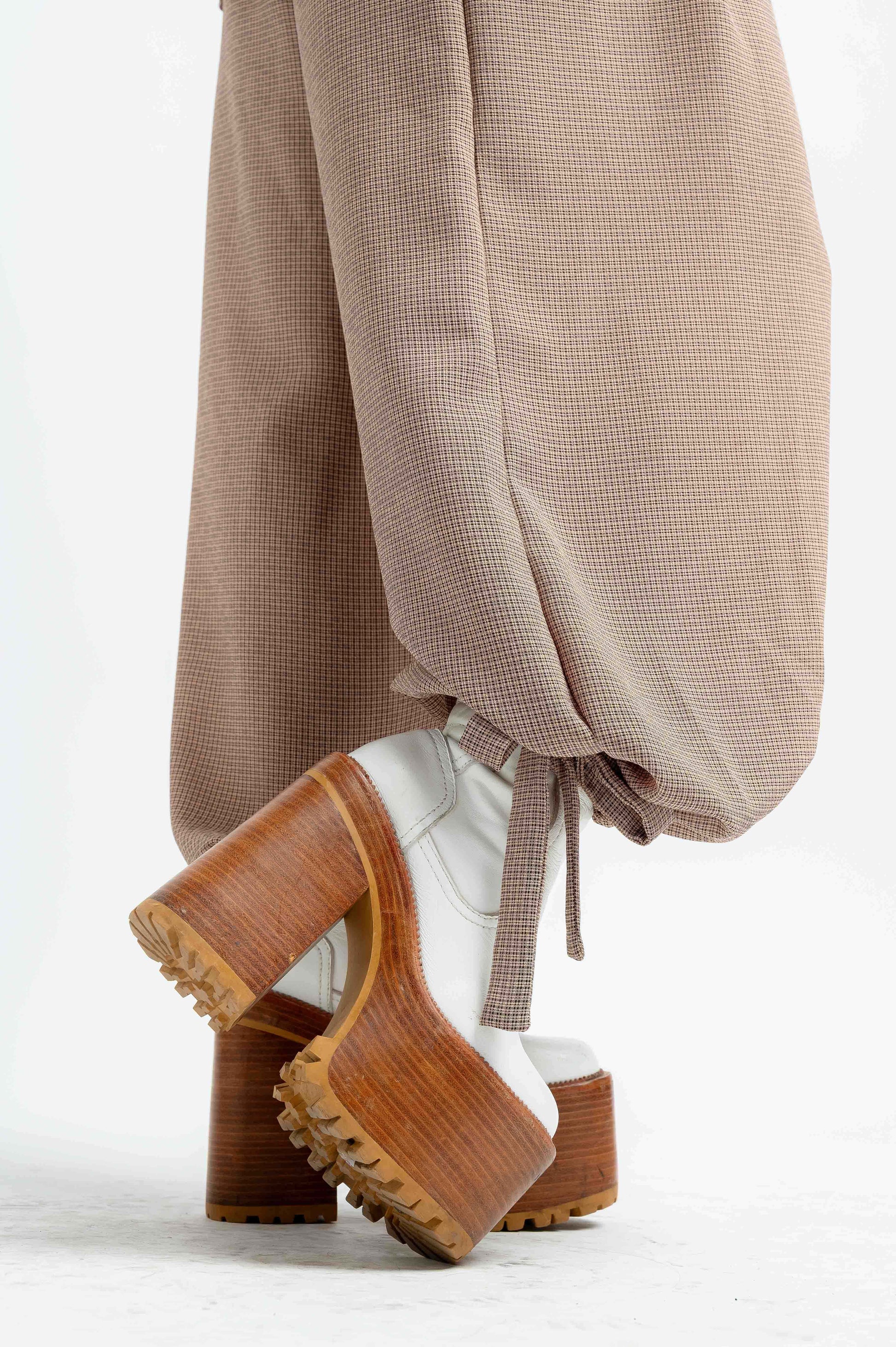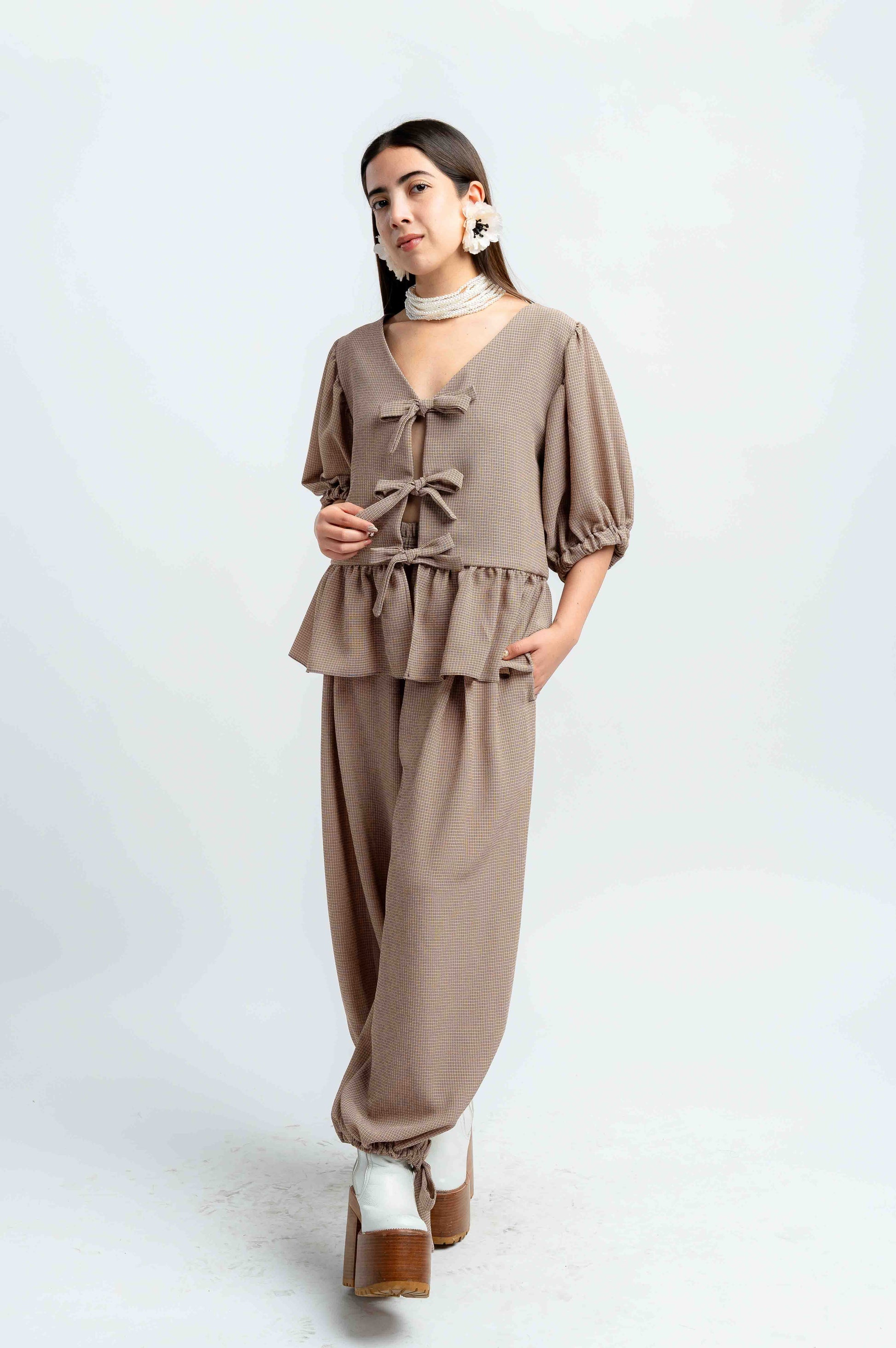 El Pantalón Agus combina comodidad y elegancia. Su corte amplio cae con fluidez y se ajusta en los tobillos con un delicado lazo que crea una silueta coqueta y relajada. Hecho en la misma tela de microcuadro que su blusa, es una pieza versátil que puedes elevar con plataformas o usar en clave casual con flats.