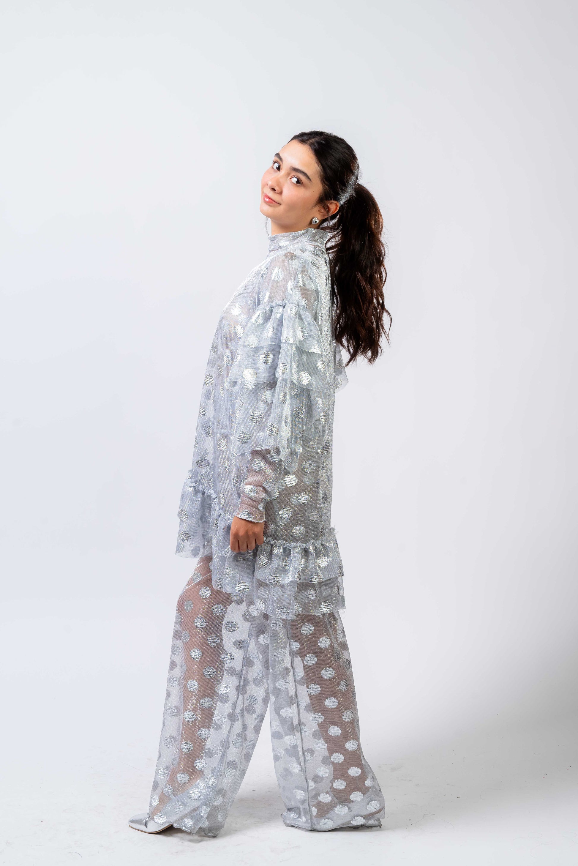 Pantalón semitransparente con brillo plateado y caída ligera. Perfecto para un look festivo y cómodo. Se adapta a cualquier top básico o glam.
