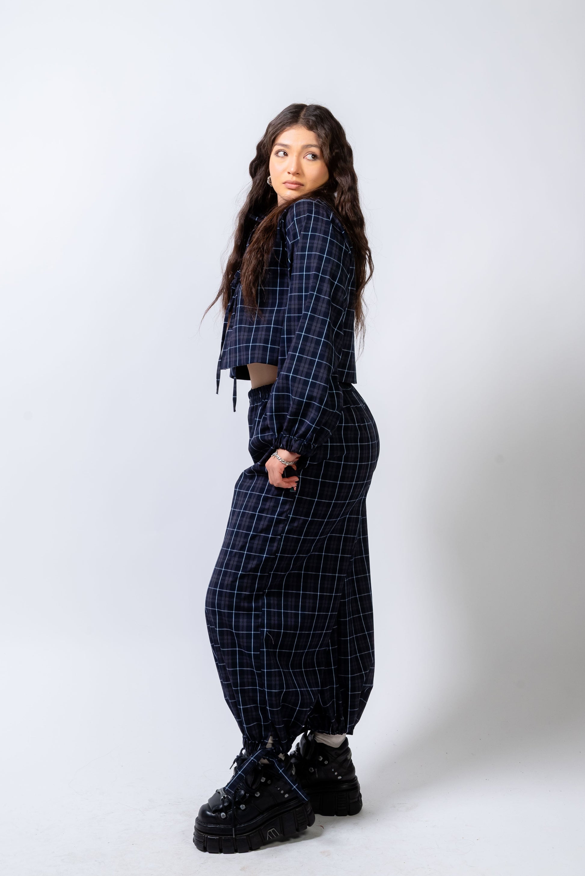 Pantalón amplio tipo jogger con estampado de cuadros y ajuste con moño en los tobillos. Cómodo, estilizado y ultra combinable.
