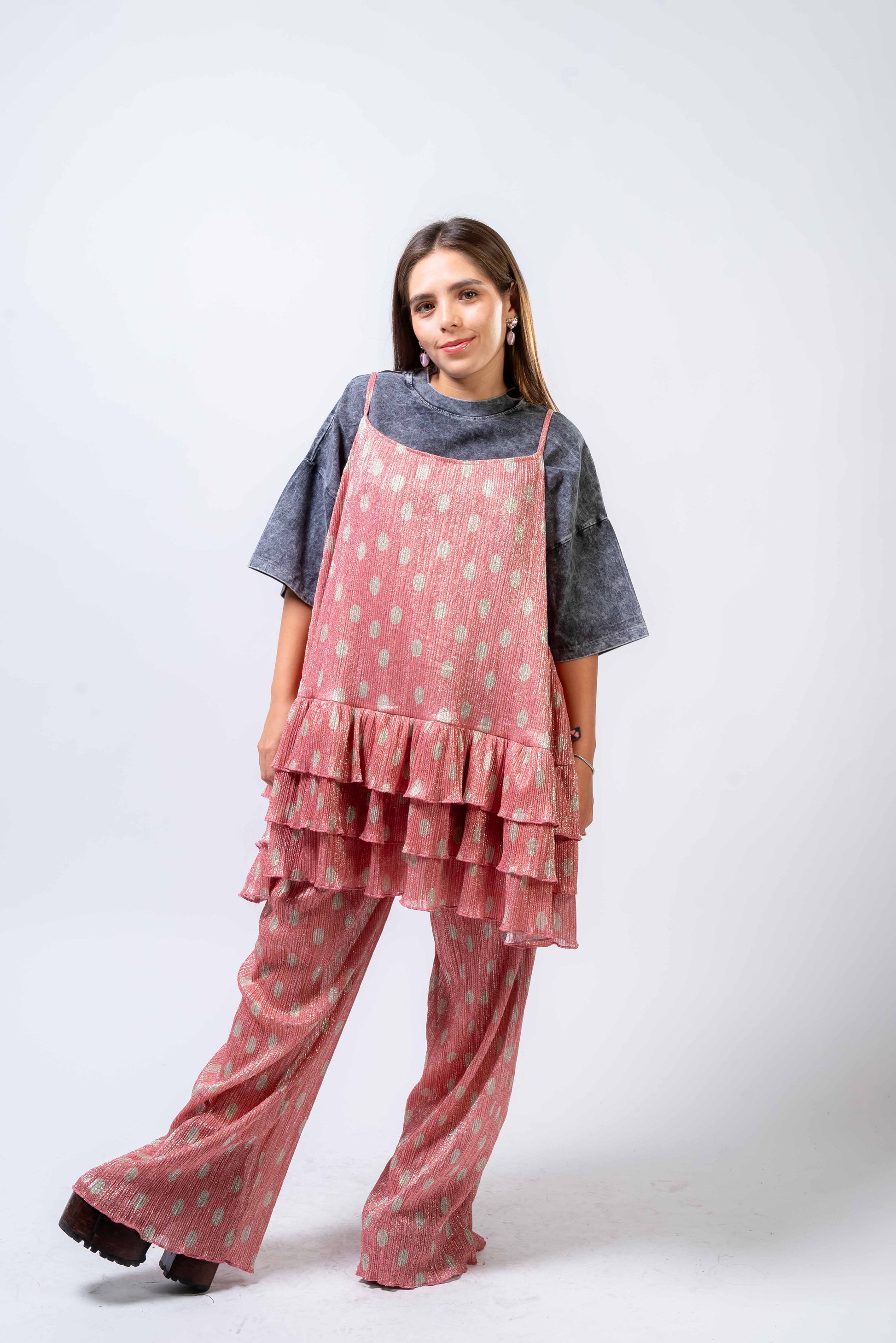 Pantalón rosa con efecto brillante y caída fluida. Cómodo, moderno y con toque girly.