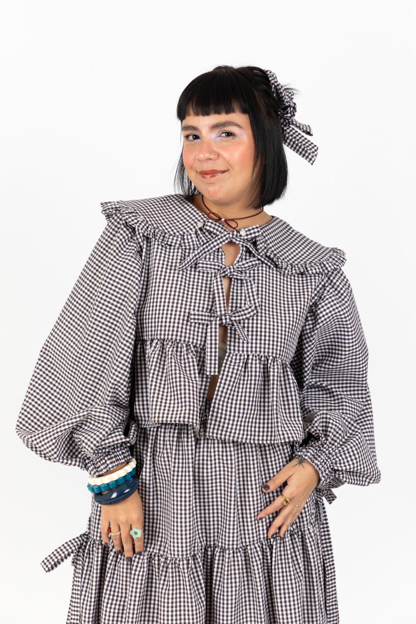 Dale un toque extra coqueto a tu peinado con la scrunchie Manuela. Hecha en tela vichy café con blanco, esta scrunchie incluye un moño grande del mismo tejido, creando un accesorio vistoso y adorable que combina perfecto con el set Mila.