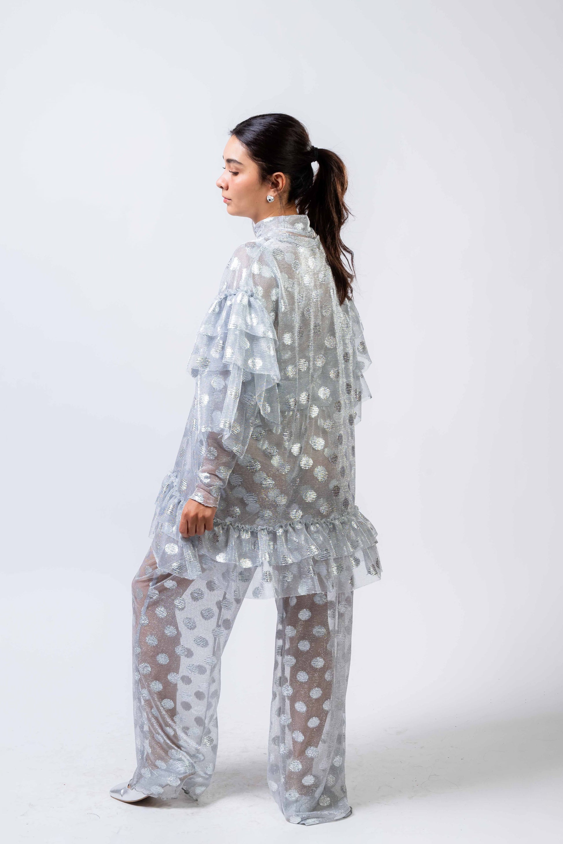 El combo más completo para looks infinitos: vestido + pantalón + camiseta en brillo plateado. Úsalo junto o separado para crear outfits ultra luminosos.