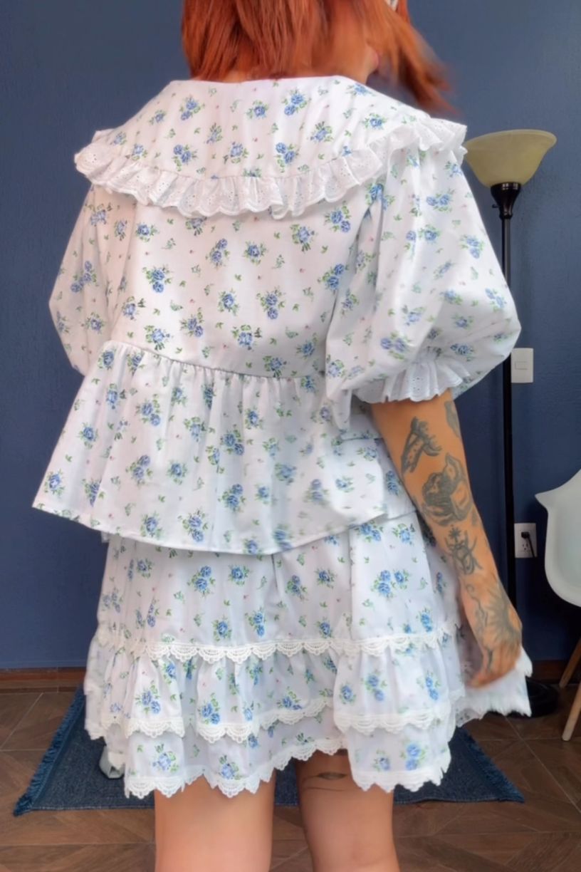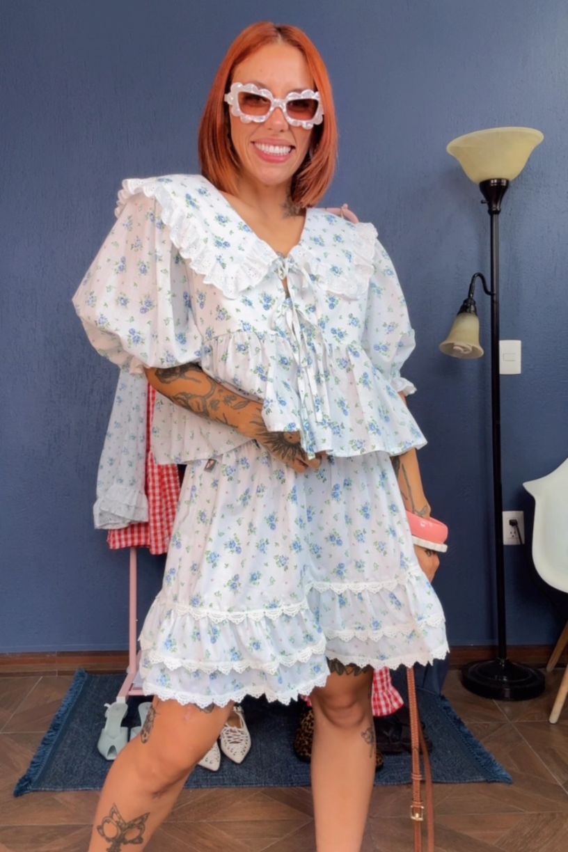 Si amabas los vestidos de tu infancia, este set es para ti. La falda de olanes con encaje y la blusa con cuello tipo babero reviven lo mejor de esa dulzura, pero con un toque moderno y coqueto. Para las que no quieren crecer del todo (y tampoco dejar de verse increíbles).