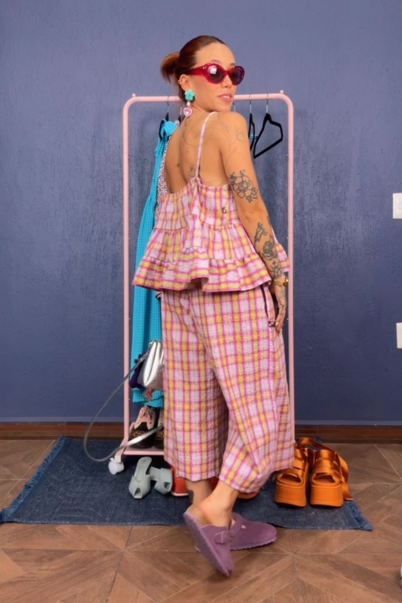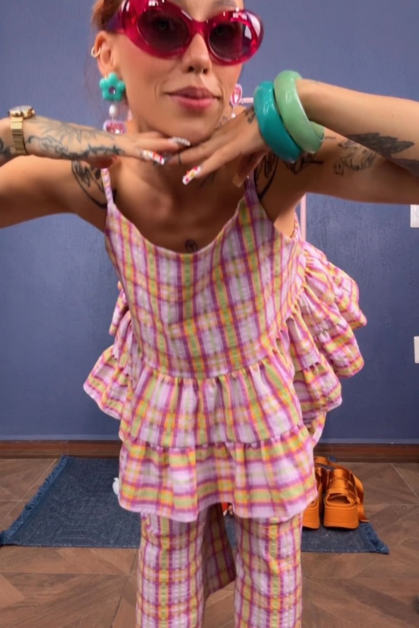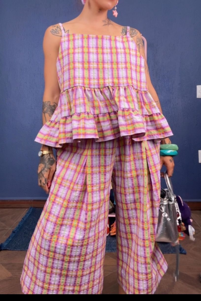Este set es una dosis de alegría en forma de ropa. El top con olanes y los pantalones amplios se mueven contigo como si celebraran cada paso. Tiene ese poder mágico de levantar tu ánimo apenas lo tocas, como cuando bailas sin razón o te ríes tan fuerte que se te olvida el ruido del mundo. No está hecho solo para que te veas bien—está hecho para que te sientas libre, juguetona y tú misma sin filtros.