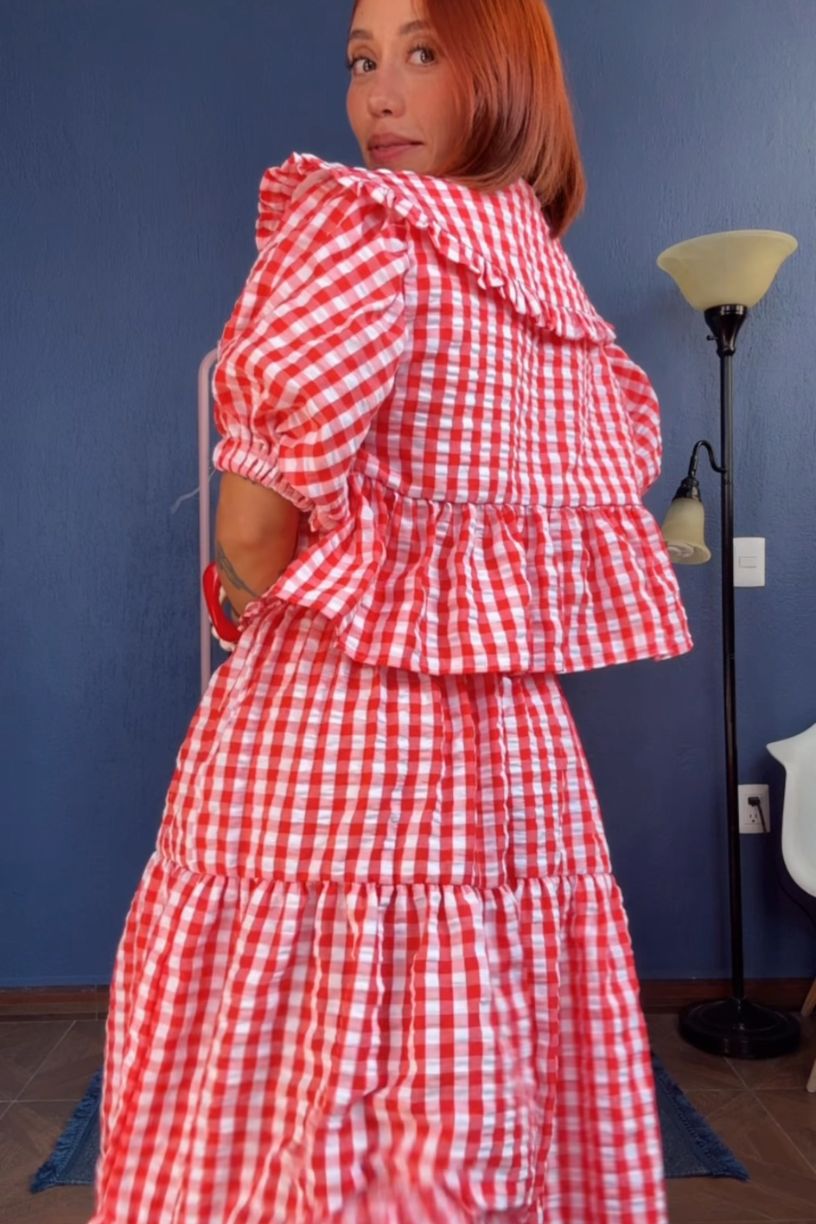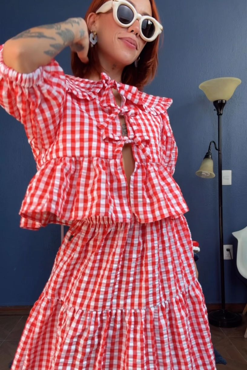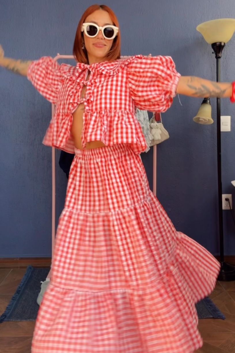 Un set que grita alegría, con cuadros vichy rojos que te harán sentir como en un picnic eterno. La blusa con cuello maxi y olanes enmarcan tu actitud divertida, y la falda amplia te invita a girar y robarte todas las miradas. Ideal para las que aman vestirse de felicidad.