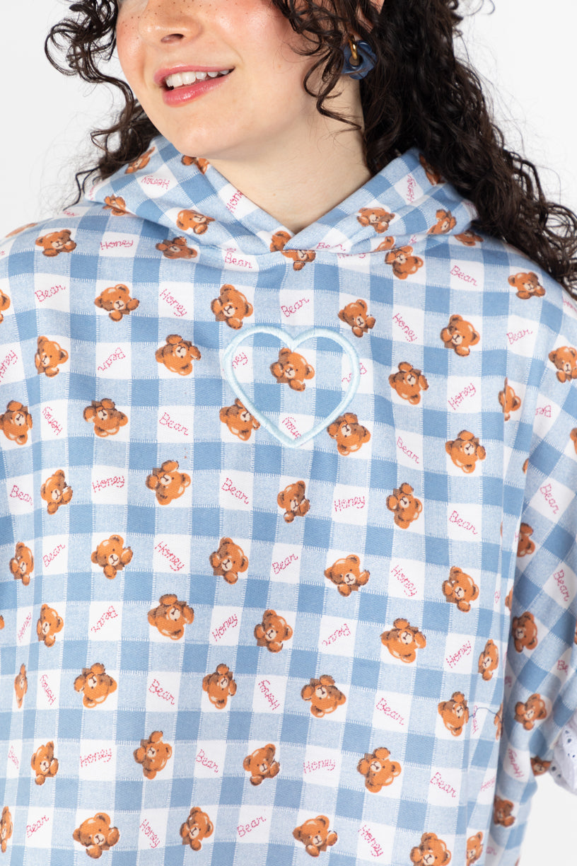 Este set une lo mejor de dos mundos: la comodidad de una sudadera con capucha y el diseño coqueto de un short con olanes. El print a cuadros con ositos, los encajes y la paleta en tonos pastel hacen que este look sea ideal para quienes aman la ropa cómoda con mucha personalidad.