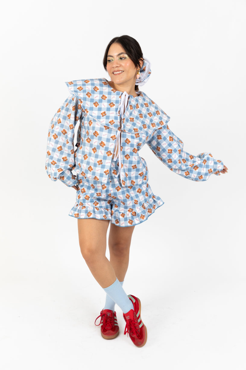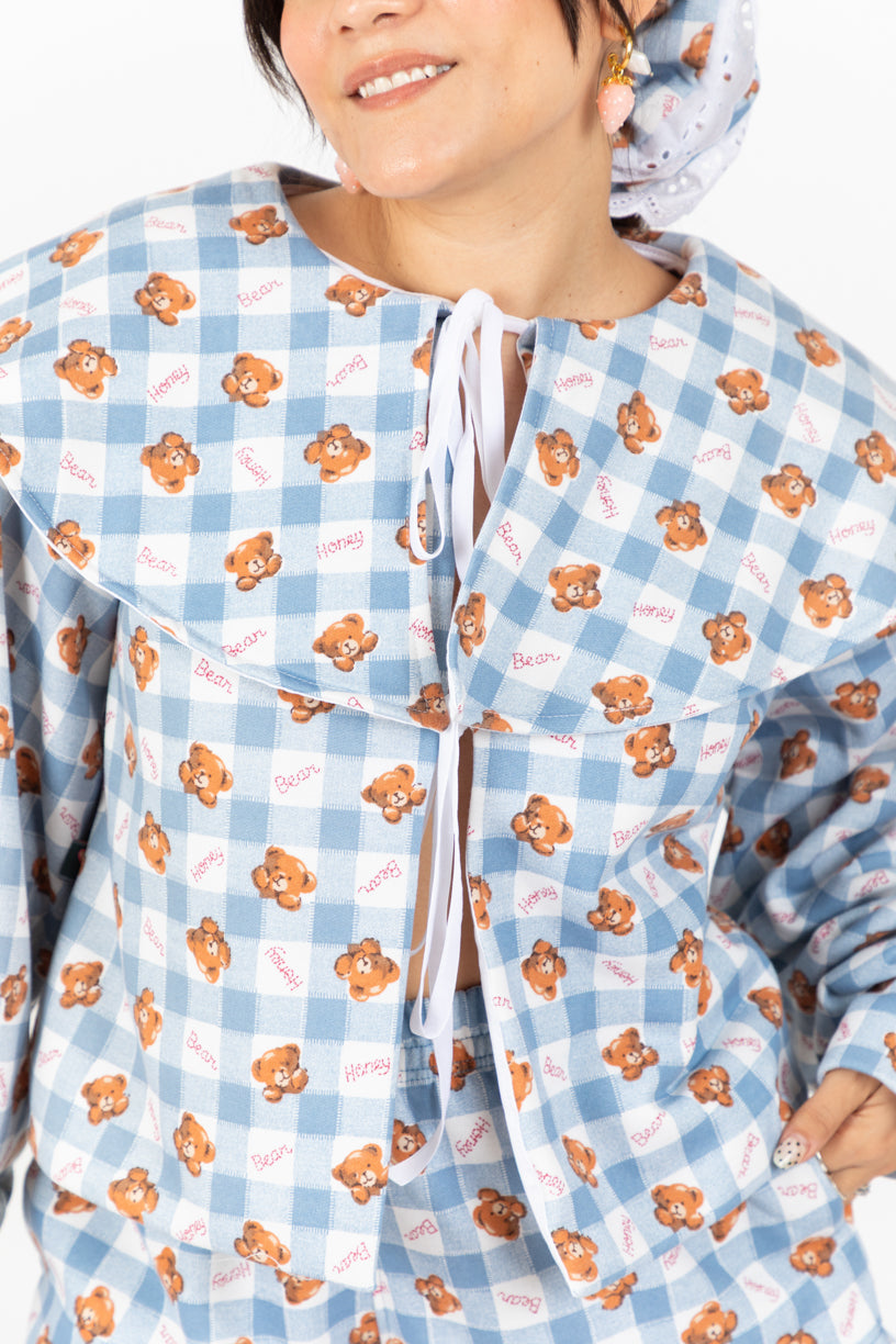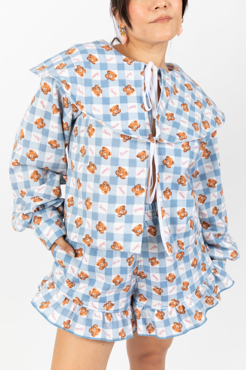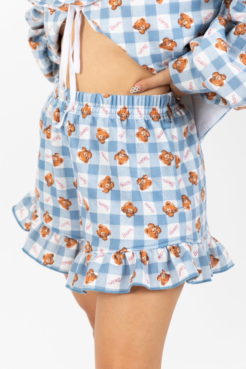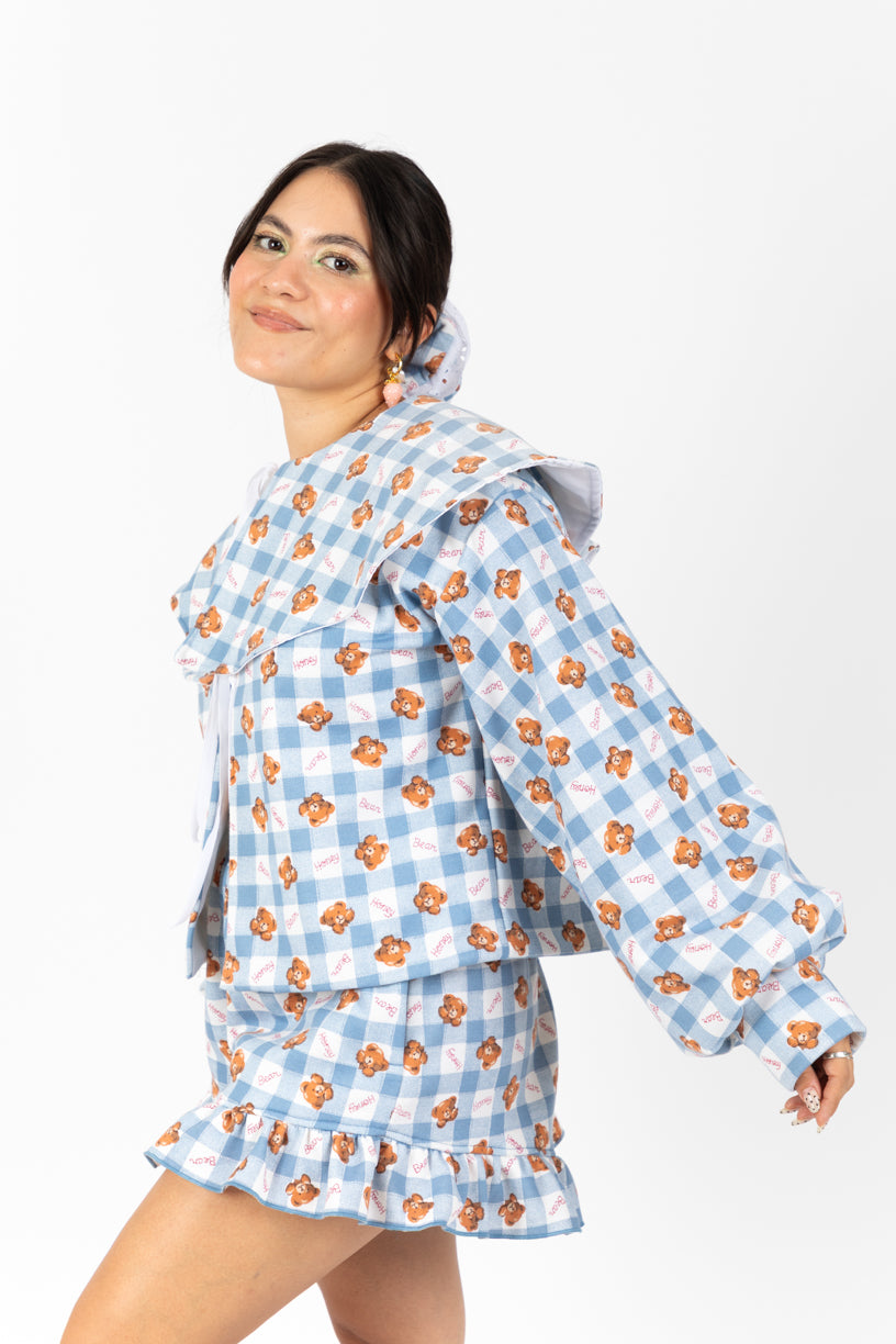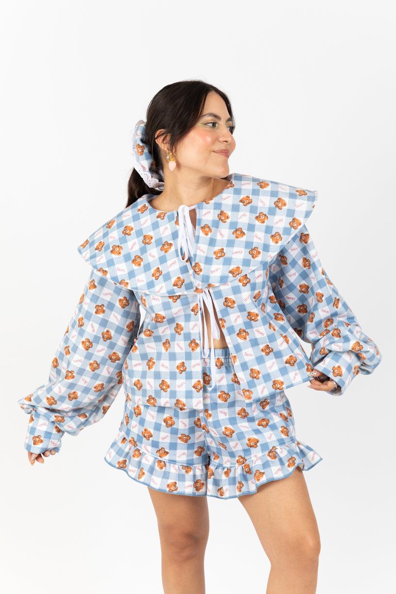 El combo más tierno y cool de la temporada. El set Luna une el suéter babydoll con cuello XL y el short con olanes para un look coordinado, cómodo y con mucha onda. El print vichy celeste con ositos y nombres le da ese toque nostálgico y divertido que roba sonrisas. Ideal para quienes no tienen miedo de jugar con la moda.