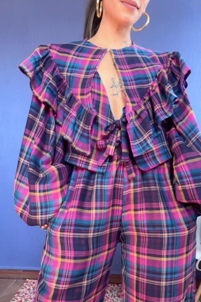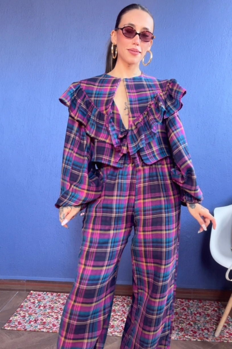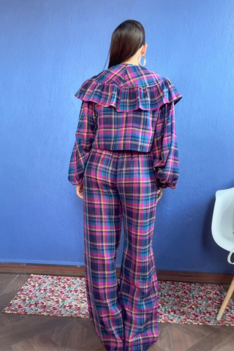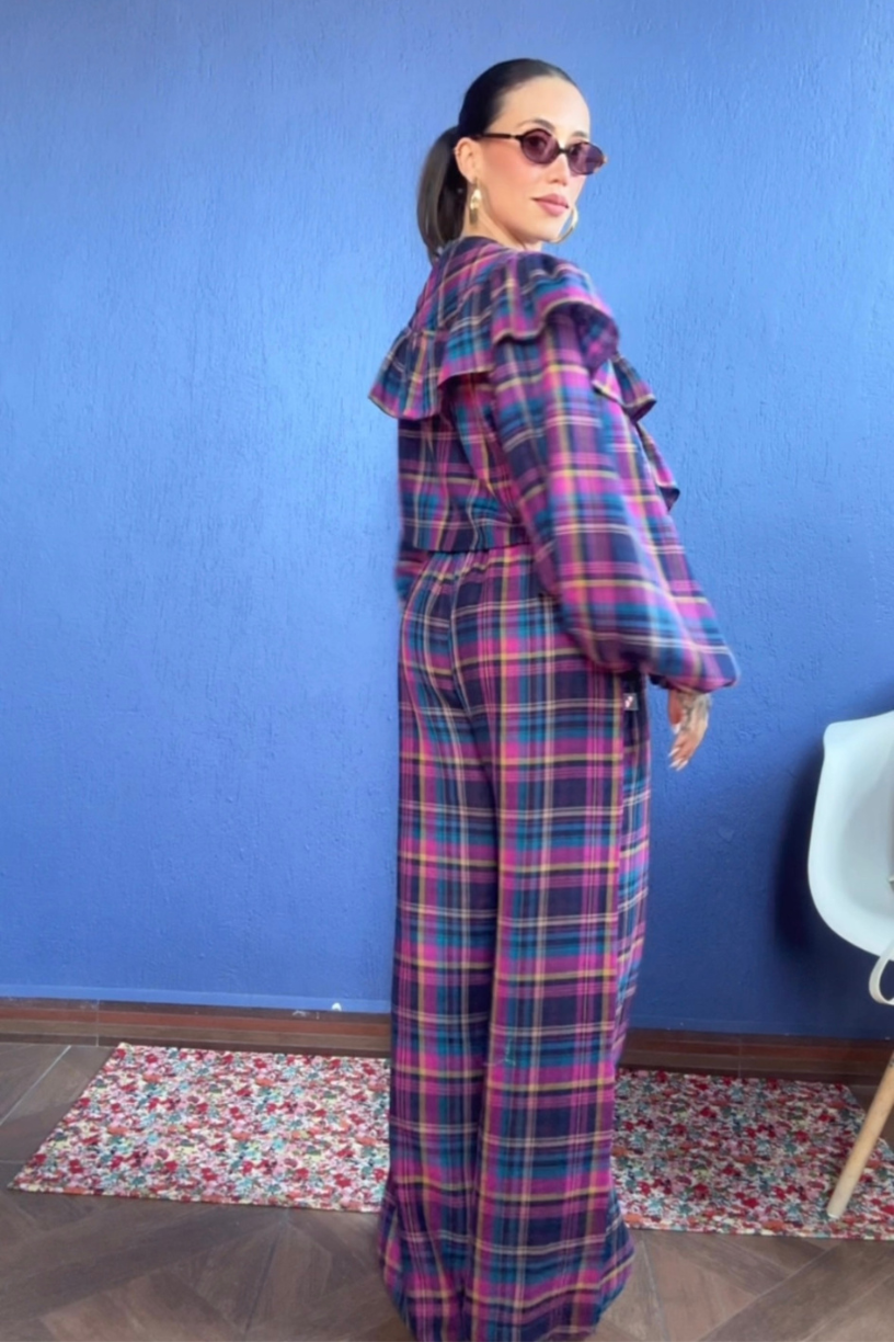 Un set lleno de personalidad, con un tejido a cuadros en rosa, marino y una línea amarilla vibrante que le da un toque inesperado. Cada prenda es especial por sí sola, pero juntas crean un outfit que transmite fuerza, actitud y mucho estilo.
