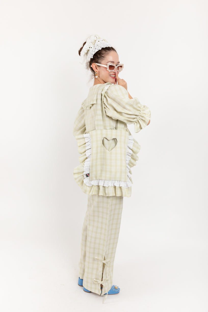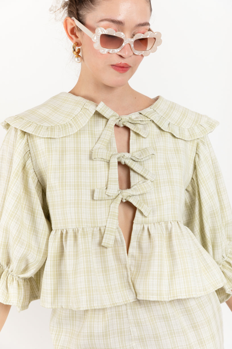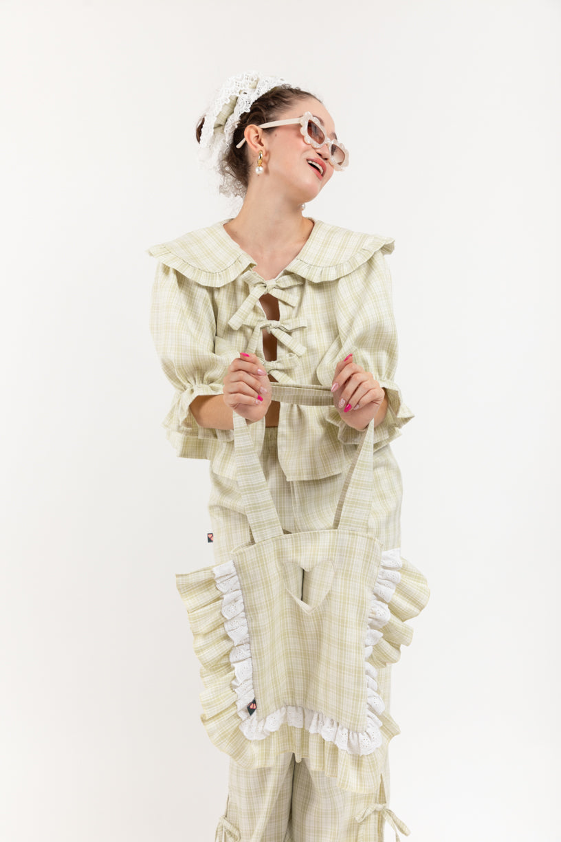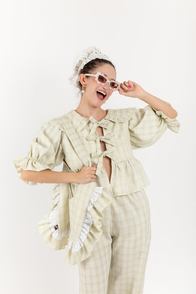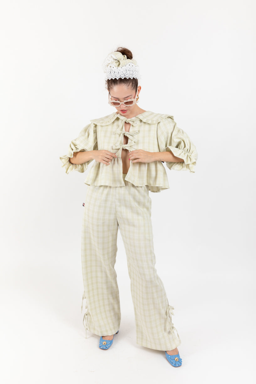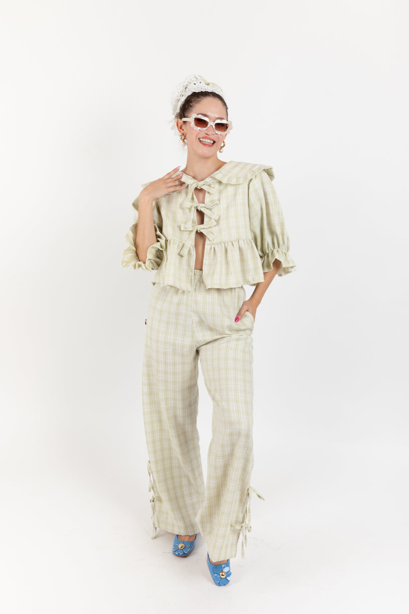 Luce como nunca con el Set Sara, un pantalón y blusa de manga corta en un romántico verde clarito. Con este set, estarás lista para cualquier ocasión con un aire fresco y femenino.