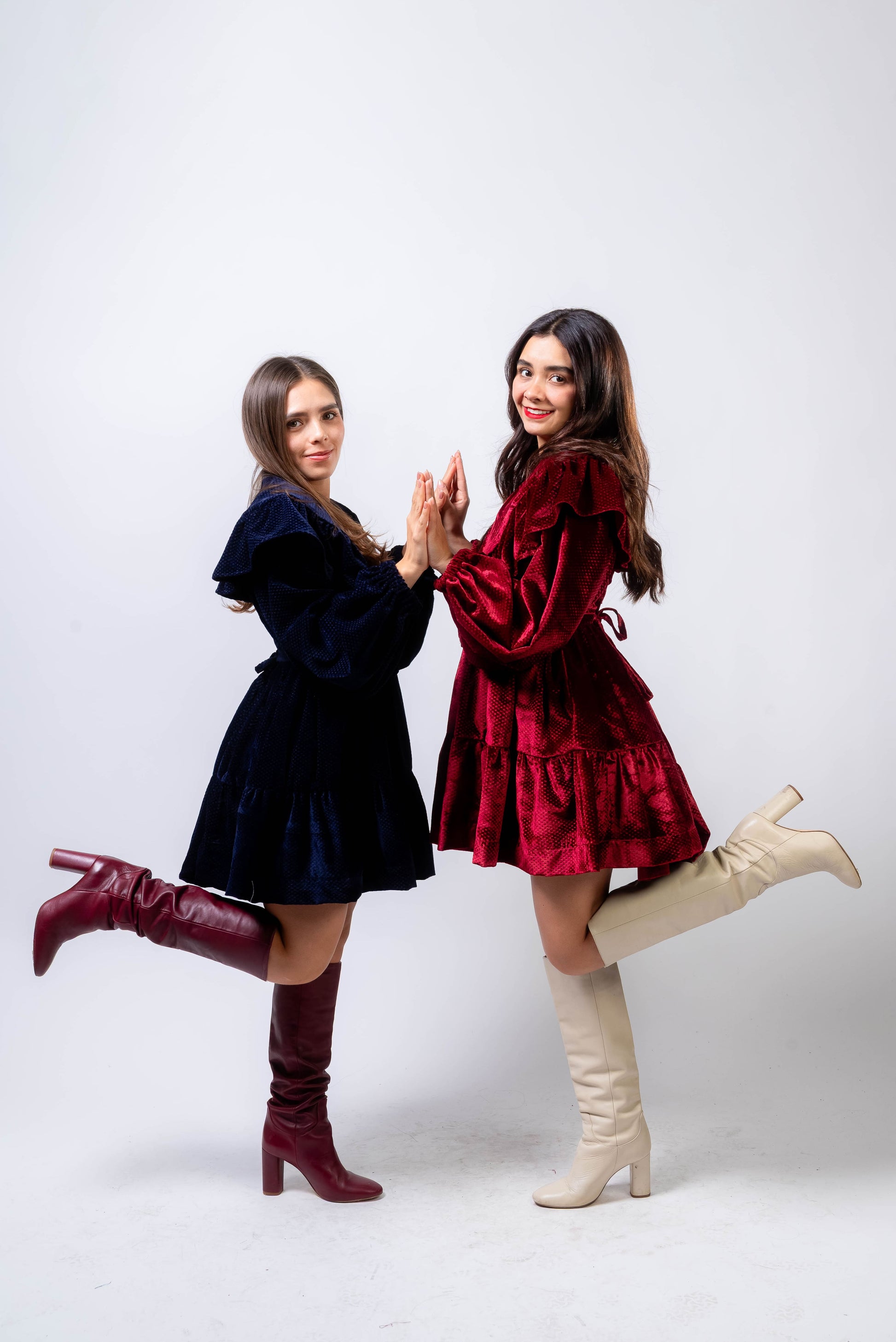El dúo ideal en terciopelo burdeos: femenino, festivo y súper sofisticado. Un look completo que roba todas las miradas.