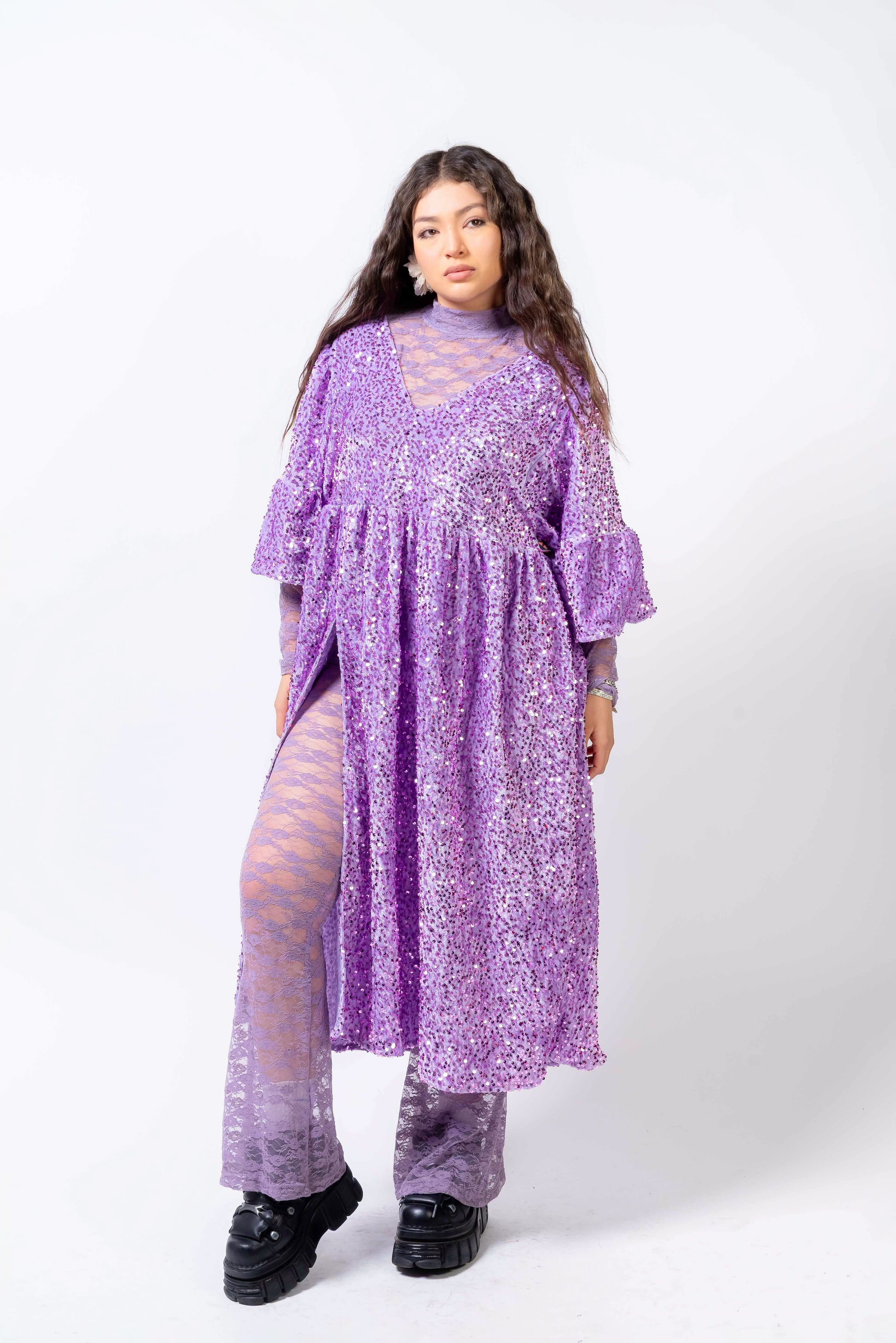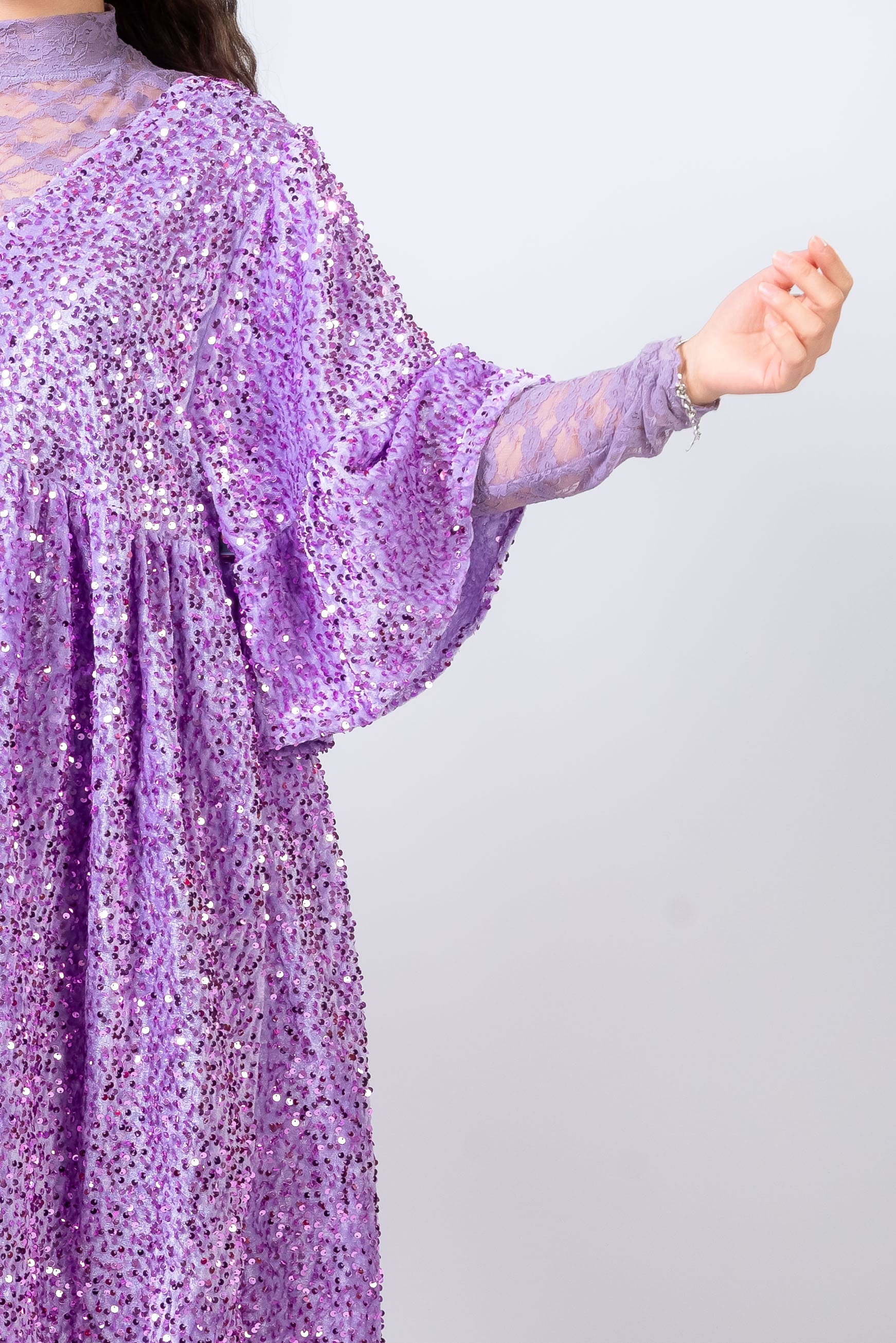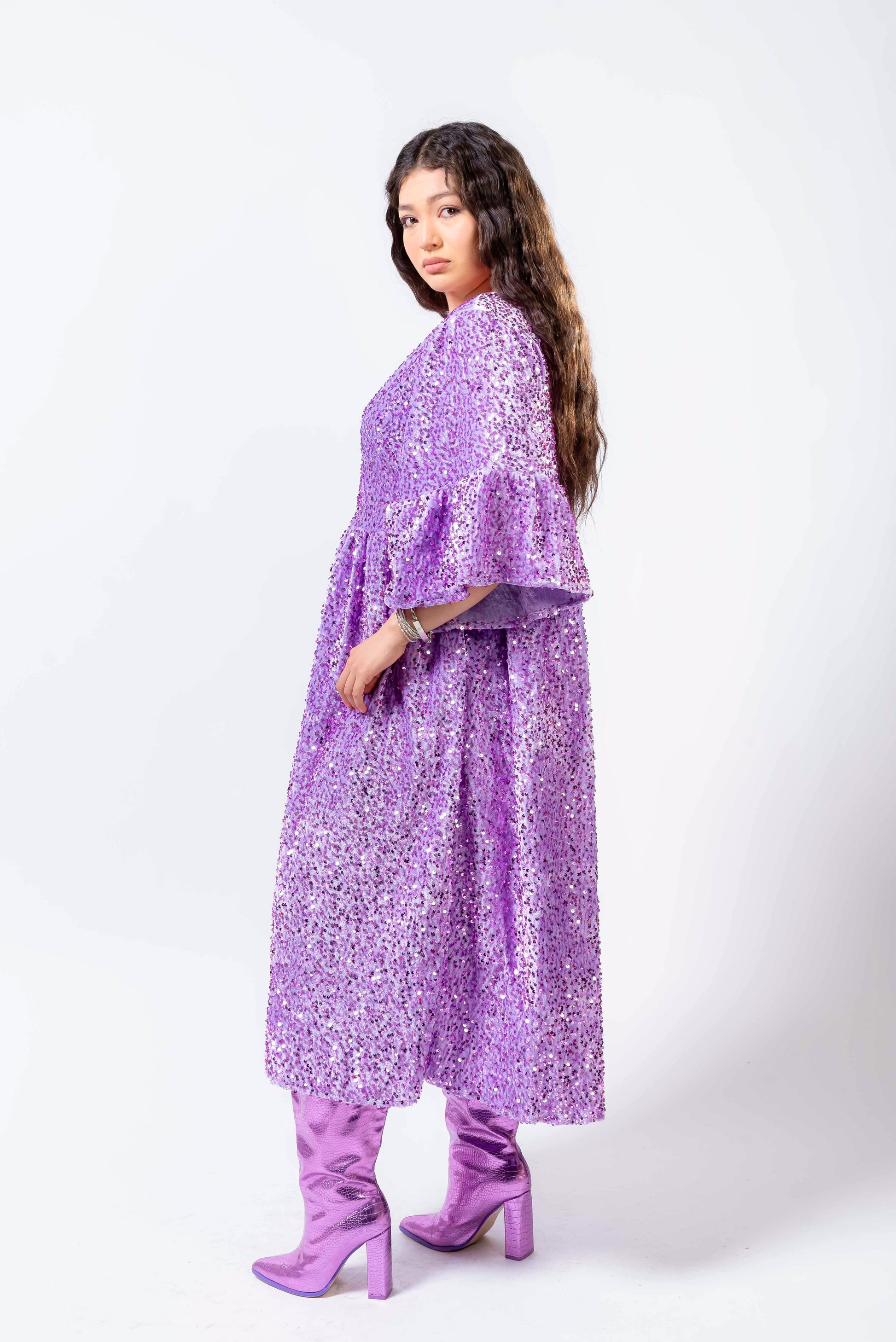 Maxi vestido brillante en tono lila, con mangas amplias y caída ligera. Perfecto para lucir radiante en cualquier ocasión especial.