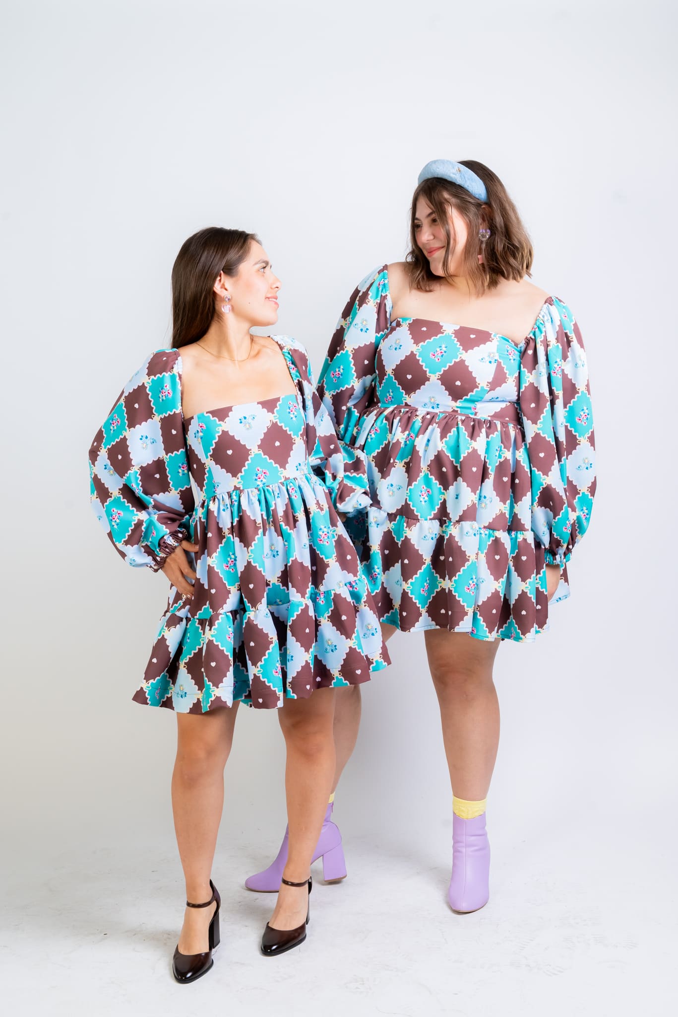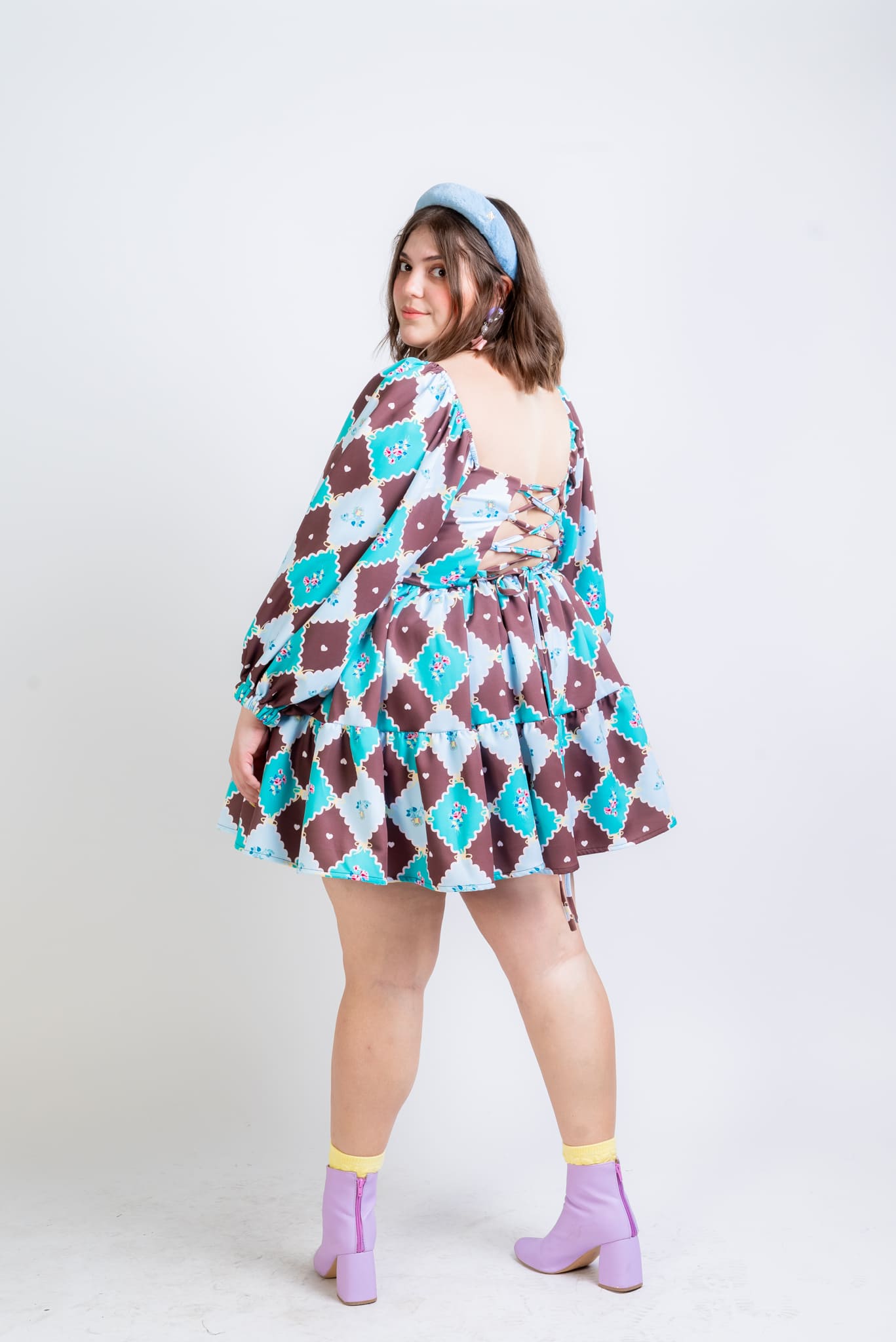 El Vestido Roma es un flechazo a primera vista. Su estampado geométrico floral en tonos chocolate, aqua y celeste crea una combinación alegre y original que no pasa desapercibida.